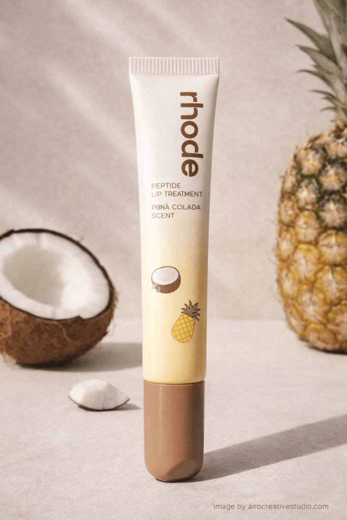 “Create a high-end, aesthetic marketing image inspired by Rhode Skin’s visual branding. Make a mockup for a new Rhode Skincare Peptide Lip Treatment that is Pina Colada scented. Show a minimalistic skincare scene with neutral tones and make the actual packaging of the lip treatment white, beige, brown and light yellow tones, and add some minimal coconuts and pineapple stickers on to it. Include subtle food-inspired elements like coconut and pineapple visuals. Make the style clean, luxury, and social-media-ready with a modern, premium aesthetic. Add a small text in the corner that says ‘image by alrocreativestudio.com’ Attached is an example of the actual Rhode Peptide Treatment Packaging shape.”